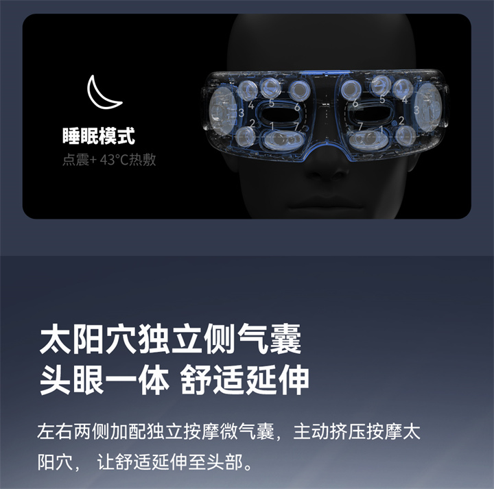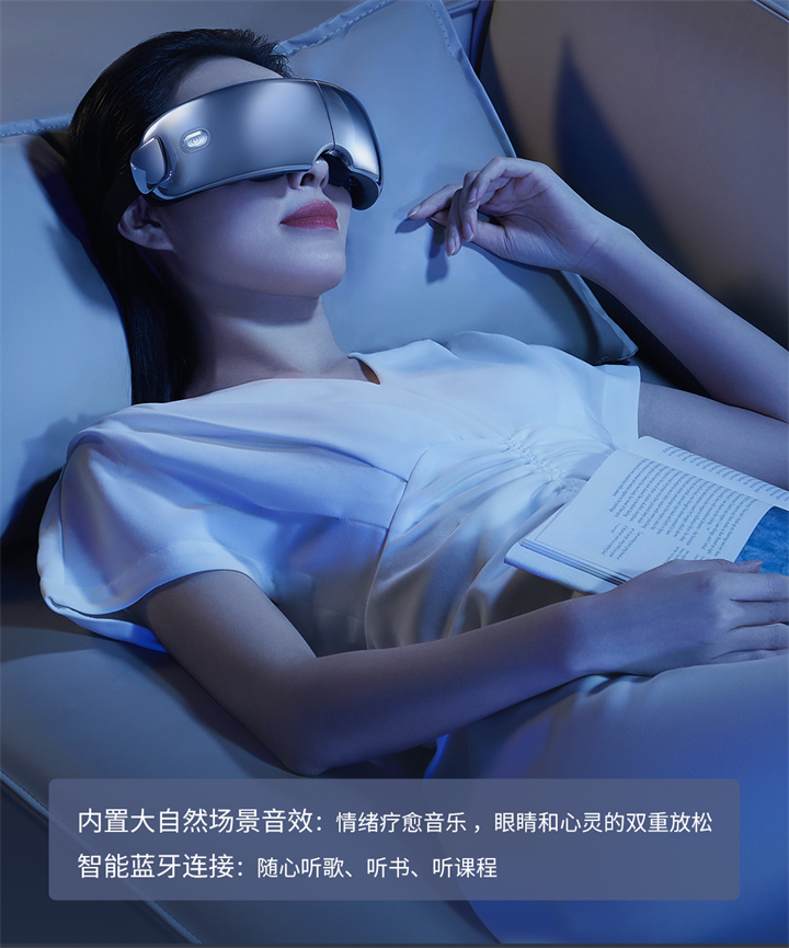 锐珀尔眼部按摩器RP-I50,根据国人眼型设计,机身弧度更贴合眼眶,贴心预留立体凹槽,保护眼球,按摩后视力不模糊,自带应急可视窗,可舒缓全黑密闭焦虑感;内置大自然的场景音效,让眼睛和心灵双重放松,还有蓝牙连接,可以随心听歌、听书等,更多神奇功能,等待您亲自试戴发现……